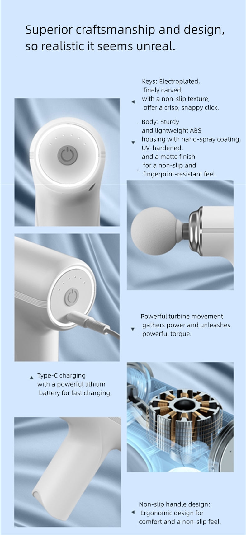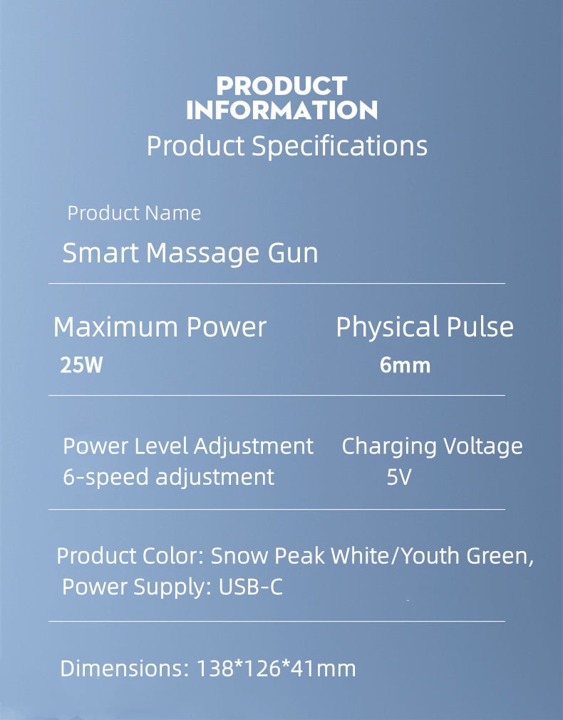 Motor Type: Brushed. Available in white (15 kg thrust) or green (15 kg thrust). Compact and portable, with multiple adjustable speeds and low noise levels. Five or more speeds. Four massage heads. Battery Life: 3-6 hours (included). Internal Battery Capacity: 1200 mAh to 2000 mAh (included). Internal Battery: Yes. Noise Level: Less than 36 decibels.